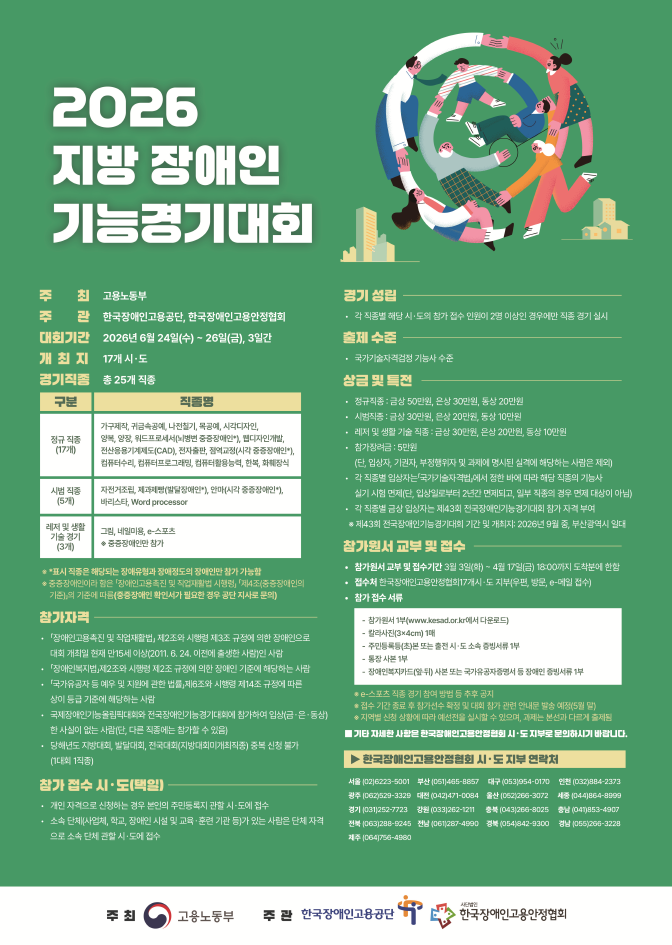 [알림] 2026년도 경상북도 장애인 기능경기대회 개최 안내 최고관리자 0 12 03.10 13:58 2026.03.10 13:58 지방기능경기대회참가신청서.hwp (57.0K) + 0 2026년도 경상북도 장애인기능경기대회 개최 주 최: 고용노동부주 관: 한국장애인고용공단, (사)한국장애인고용안정협회대회기간: 2026. 6. 24.(수) ~ 2026. 6.26.(금) 3일간개최지 및 경기 직종: 전국 17개 시 · 도, 총 25개 직종문의전화: 054-873-6011많은 참여 바랍니다.