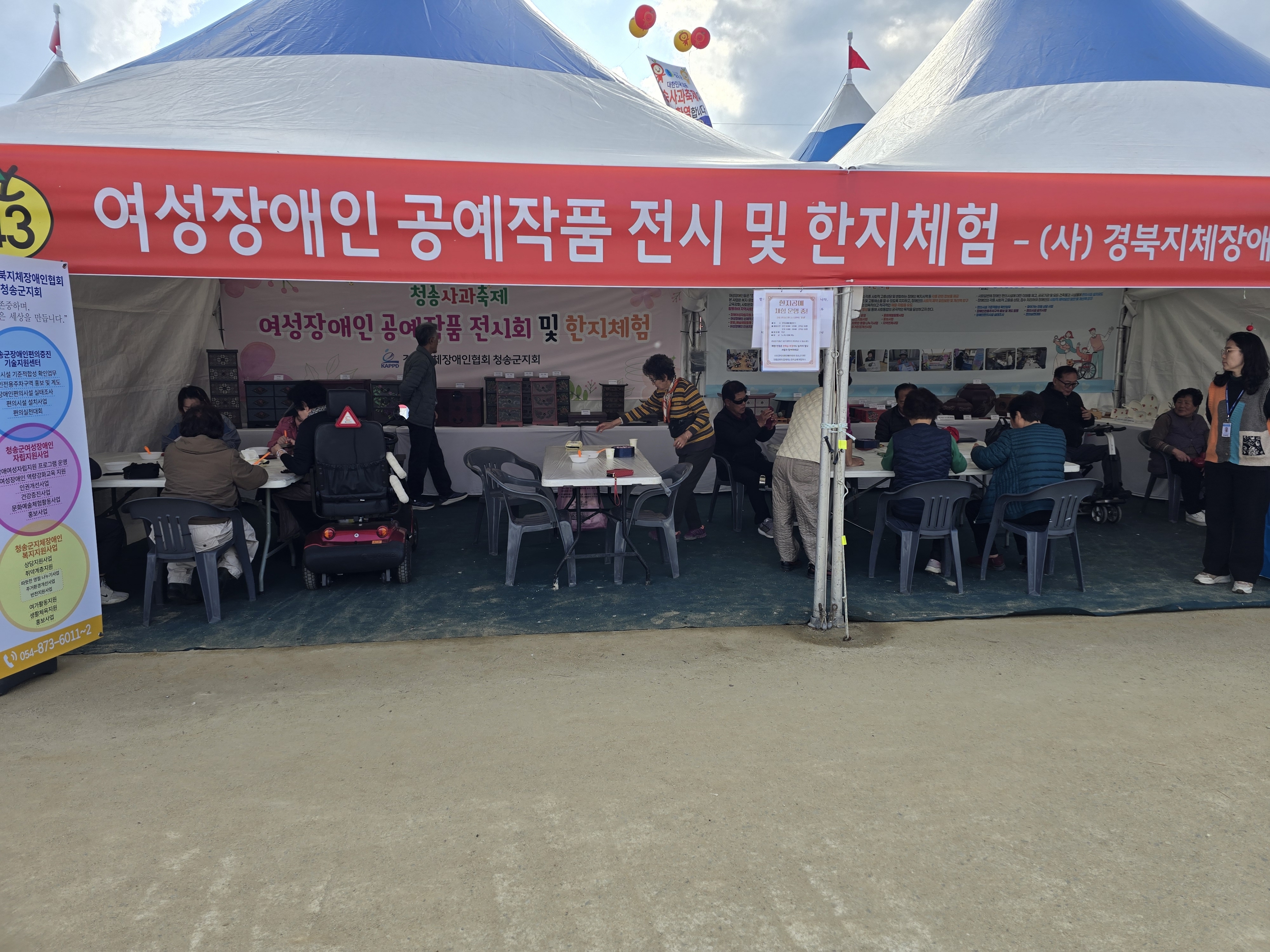 [여성/편의/복지] 제19회 청송사과축제 '2025 여성장애인 작품전시 및 한지공예체험 사업' / 지회 홍보 부스운영 3일차 최고관리자 0 236 2025.12.01 18:03 제19회 청송사과축제 '2025 여성장애인 작품전시 및 한지공예체험 사업' / 지회 홍보 부스운영2025. 10. 30. 청송사과축제 3일차방문객의 적극적인 참여로 체험이 조기마감 될 만큼 호응이 높았고, 전시된 작품에 대한 관심과 반응을 이끌어 내었습니다.아울러 편의·여성·복지 사업별 홍보를 통해 방문객들의 질의와 관심이 이어지며 긍정적인 반응을 얻었습니다.