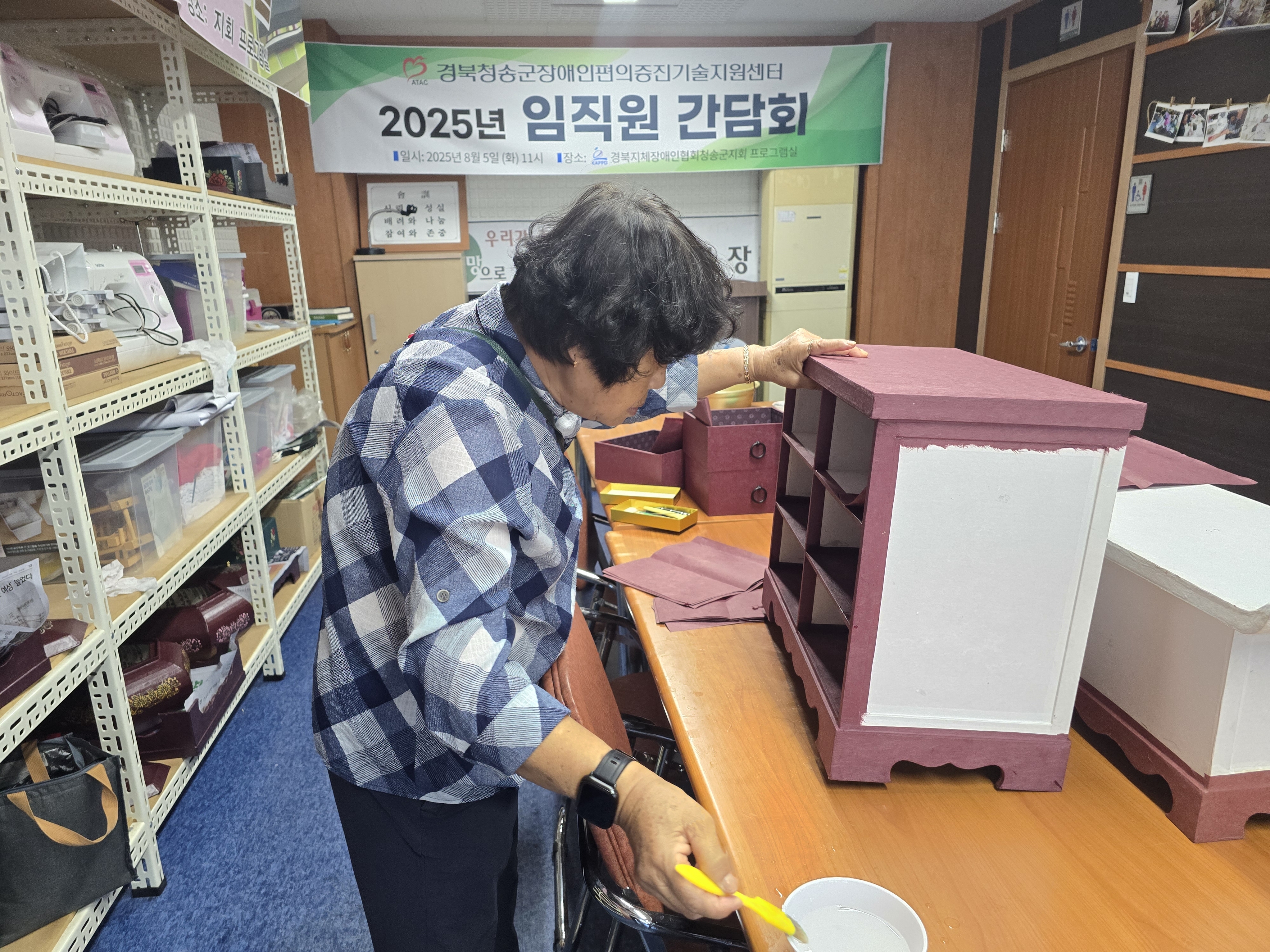[여성] 2025 여성장애인 한지공예 자조모임 8차 진행 최고관리자 0 242 2025.12.01 17:45 2025 여성장애인 한지공예 자조모임한지공예 자조모임 8차 진행2025. 10. 1.(수) 13:00~15:00김태순(현동) : 6서랍, 3단 서랍, 사각단지 임복순 : 6서랍, 반닫이 함김태순(청송) : 5단서랍, 앵두장, 휴지함