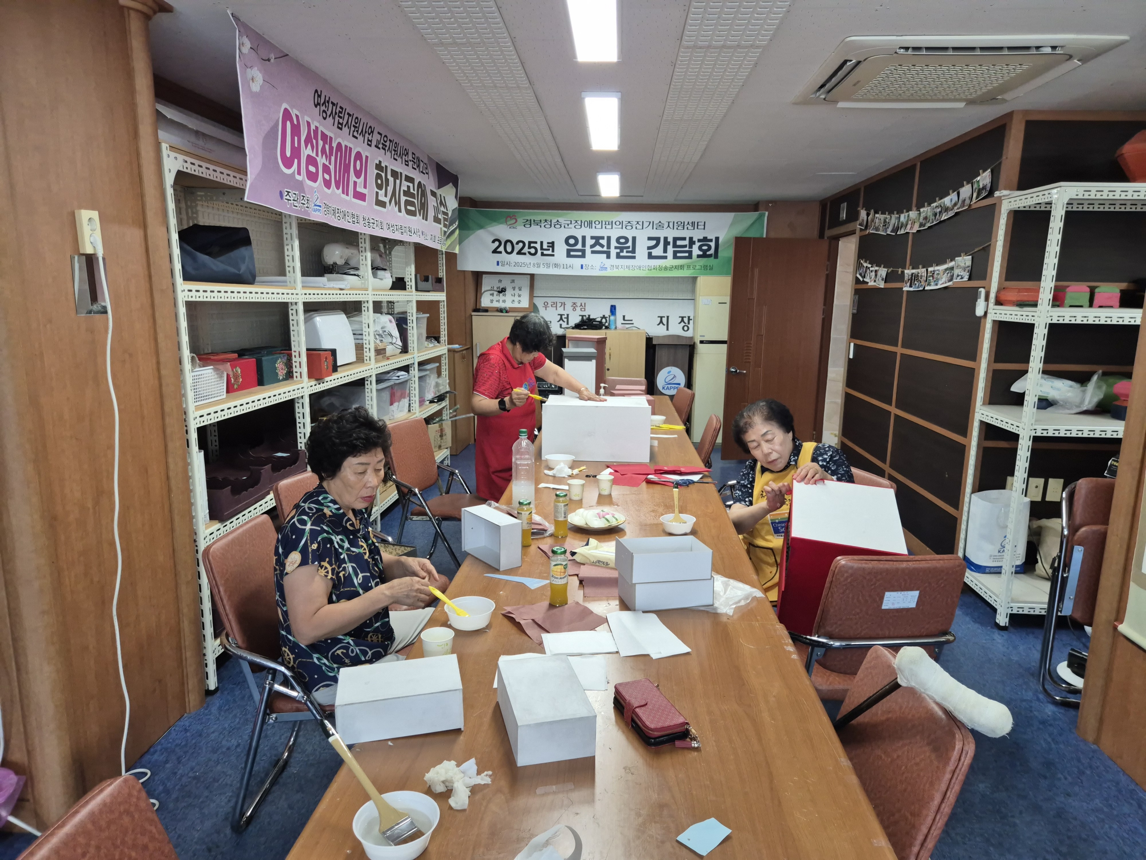 [여성] 2025 여성장애인 한지공예 자조모임 3차 진행 최고관리자 0 360 2025.09.10 18:54 2025 여성장애인 한지공예 자조모임한지공예 자조모임 3차 진행2025. 9. 3.(수) 13:00~17:00김태순(현동) : 6서랍 초배지 바르기임복순 : 반닫이 함 겉지 바르기김태순(청송) : 앵두장 초배지 바르기